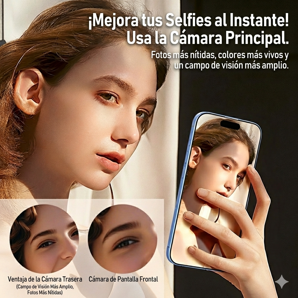 Se coloca fácilmente en la parte posterior del celular y duplica exactamente lo que ves en tu pantalla, permitiéndote verte en tiempo real mientras usas la cámara trasera.